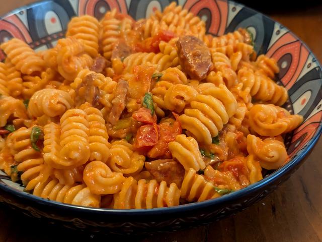 Venison sausage and bell peppers come together with a velvety vodka infused tomato cream sauce to make a hearty dish with a rich, flavorful twist.